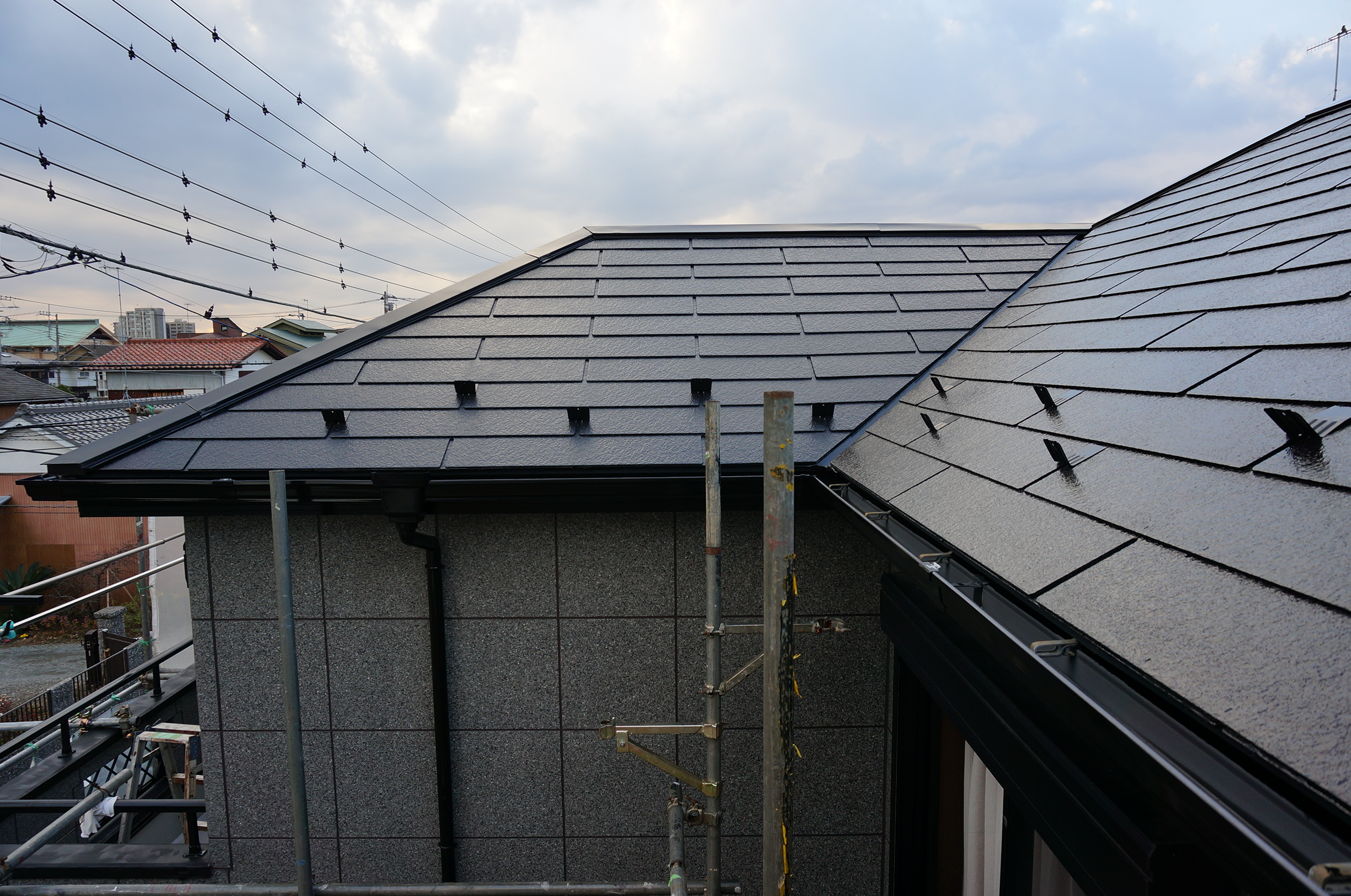 屋根塗料はエスケー化研株式会社の遮熱クールタイトのブラックを使用。