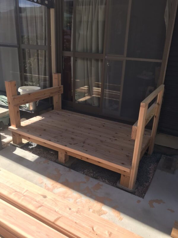 基礎部整地、高さ調整をし新規デッキを施工していきました。